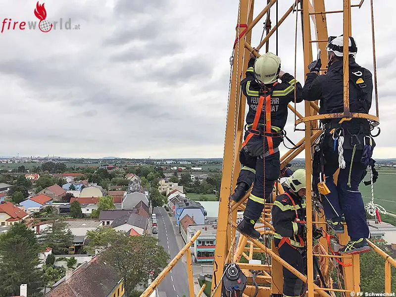 SCHWECHAT (NÖ): Am Samstag, den 20. Mai 2017, hatte die Freiwillige Feuerwehr Schwechat die Möglichkeit gemeinsam mit den Kameraden der Freiwillige Feuerwehr Schwechat-Kledering eine Übung zum Thema „sicheres Arbeiten in Höhen“ auf einer Baustelle in Kledering durchzuführen.