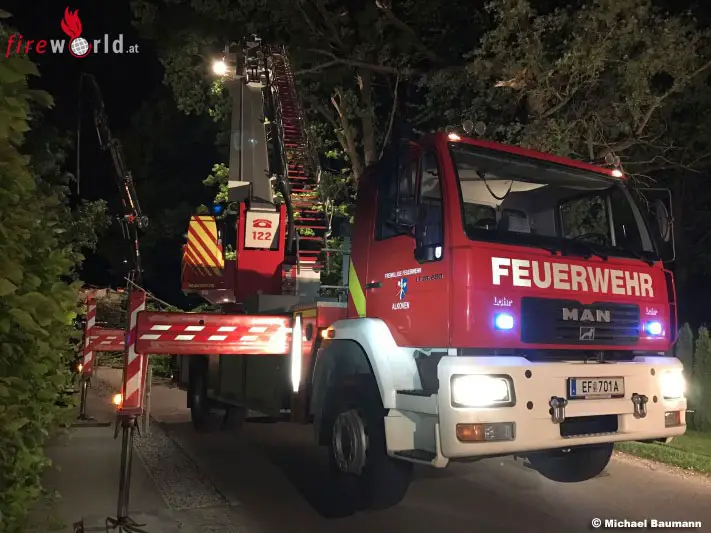 WILHERING / ALKOVEN (OÖ): Um 22.11 Uhr des 19. Mai 2017 wurde die Feuerwehr Alkoven von der Feuerwehr Schönering mit der Teleskopmastbühne sowie dem Kranfahrzeug zum Assistenzeinsatz bei einem Sturmschaden alarmiert.