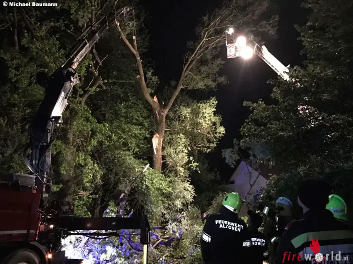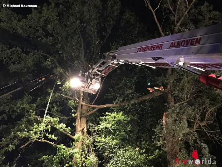 Vor Ort lag ein Baum über der Fahrbahn. Mehrere Baumteile hingen über der Fahrbahn absturzdrohend in der verbliebenen Baumkrone fest. Aufgrund des Gefahrenpotenzials für Verkehrsteilnehmer wurde in Absprache mit dem Einsatzleiter (Feuerwehr Schönering) entschieden, per Kran und Teleskopmastbühne den Baumteil zu sichern bzw. stückweise abzutragen. „Problematisch war, dass man aufgrund des Gewirrs an Ästen nicht sagen konnte, wie das Gewächs selbst sich verhalten würde, wenn man den großen, losen Ast einfach entfernt“, schildert einer der beteiligten Feuerwehrmänner der FF Alkoven, Michael Baumann.