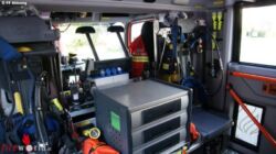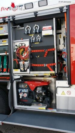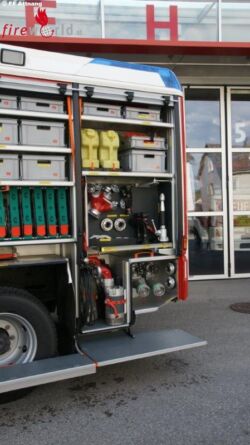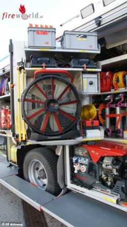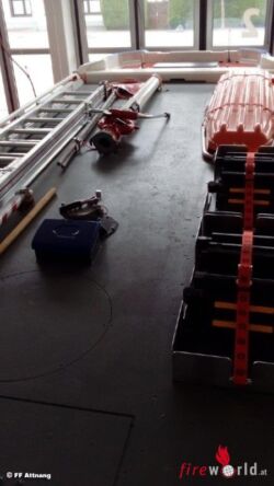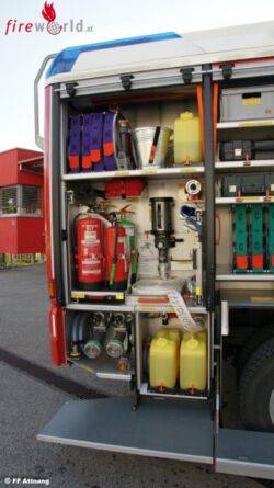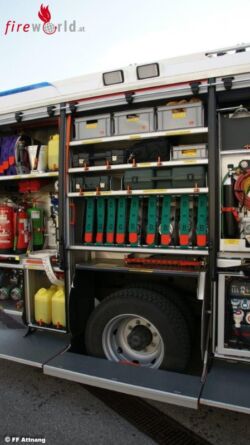 Ein ordentlicher Ausstieg für die Einsatzmannschaft ist mit der Drehtreppe auch gegeben. Im Geräteraum 1 befinden sich Hydraulisches Rettungsgerät, Unterbauschiebeblock, Greifzug und die dazugehörenden Seilschlingen, Spine Board, Motorkettensäge, Rettungssäge, Werkzeugkiste VU, verschiedenes Handwerkzeug und ein Luftanschluss Im Geräteraum 3 findet man B & C Druckschläuche sowie Absturzsicherung, Notrettungsset, Chemiefaserseil, und Arbeitsleinen. Auch zu sehen der Sicherungskeil bei Arbeiten mit der Seilwinde. Im Geräteraum 5 üblicherweise die Wasserführenden Armaturen , 2 Stk. Wasserpumpen, Schachtabdeckung, Auffangtassen und Ölbindemittel. In Fahrtrichtung rechts gut zu sehen das Design dieses schon auf allen Fahrzeugen der FF Attnang zu sehen ist. Im Geräteraum 2 sehen wir den Stromerzeuger RS 14, Hebekissen mit Steuerungsgerät, 4Stk. Rangierroller, Wagenheber, Elektrischer Hochleistungslüfter, Kabeltrommel, Reservekanister, Warnleuchten.