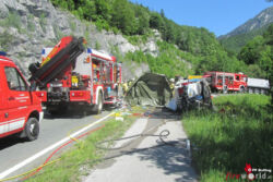 GOLLING (SBG): Zu einem schweren Verkehrunfall auf der B159, Höhe Pass Lueg, wurde die Feuerwehr Golling an diesem Freitag Nachmittag, 26. Mai 2017, gerufen. Der schwerverletzte Fahrer musste mit hydraulischem Rettungsgerät und Rettungssäge aus seinem Fahrzeug befreit werden.