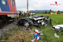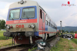 PETTENBACH (OÖ): In Pettenbach (Bezirk Kirchdorf an der Krems) wurde Mittwochvormittag, 31. Mai 2017, ein Pkw auf einem Bahnübergang von einem Triebwagen der Almtalbahn erfasst. Die Lenkerin wurde eingeklemmt und schwer verletzt.