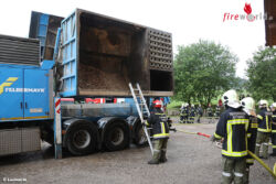 "Wir sind zu einem Brand Gewerbe alarmiert worden und haben hier laut Angaben der Arbeiter einen Brandverdacht im Bereich des Sägespänesilos eruiert. Dann haben wir mit der Wärmebildkamera den Silo abgetestet und festgestellt, dass im Bereich des Austrages 120 Grad sind. So wurde begonnen, die Hackschnitzel herauszufördern. Zu einer Verpuffung ist es dann gekommen, wie wir mit dem Saugwagen begonnen, haben abzusaugen. Da hat es dann wahrscheinlich eine Staubexplosion gegeben. Genaueres können wir auch noch nicht sagen. Wir öffnen jetzt den Silo, schneiden die Wand auf und werden dann die Hackschnitzel, welche sich im Silo befinden, ausräumen," schildert Franz Oberndorfer, Einsatzleiter der Feuerwehr Gaspoltshofen.
