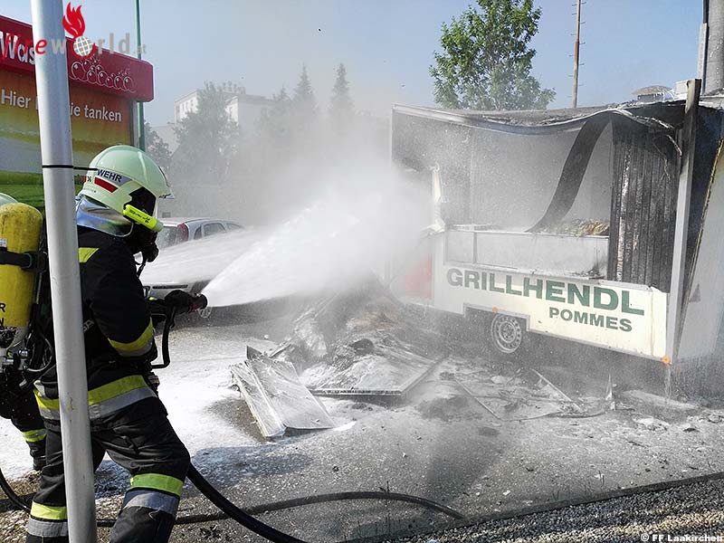Der fahrbare Grillstand befindet sich auf dem Gelände des Lagerhauses Laakirchen und in örtlicher Nähe zu einer Tankstelle. Da der Gasgrill des Verkaufsstandes über zwei Gasflaschen mit je 30 Liter Inhalt versorgt wird, bestand bei den Löscharbeiten in der Erstphase höchste Explosionsgefahr.