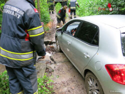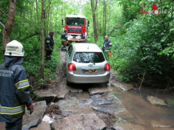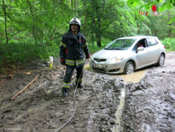 Bei der Ankunft an der Einsatzstelle mit ELF, SRF, KRF und elf Mann wurde festgestellt, dass sich ein Pkw auf einem Waldweg im schlechten Untergrund festgefahren hatte. Das Fahrzeug konnte mittels Seilwinde nach etwa einer Stunde Einsatzzeit erfolgreich aus der misslichen Lage befreit werden.