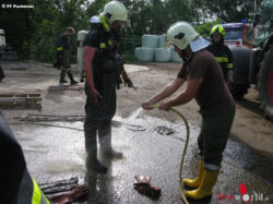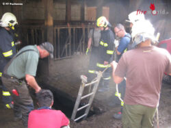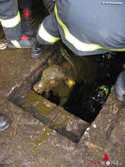 Zwei Kälber waren in eine Jauchegrube gestürzt. Gesichert und mit schwerem Atemschutz stiegen zwei Mann in die Jauchegrube und konnten eines der beiden Kälber lebend retteten. Für das zweite Kalb kam leider jede Hilfe zu spät, dieses konnte leider nur noch tot geborgen werden. Nach rund einer Stunde konnte die Feuerwehr Puchenau wieder ins Feuerwehrhaus einrücken und mit der intensiven Reinigung der Einsatzbekleidung und der Ausrüstungsgegenstände beginnen.
