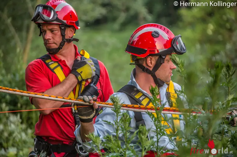 Oö: Höhenretterübung → Personenrettung aus reißendem Hochwasserfluss trainiert