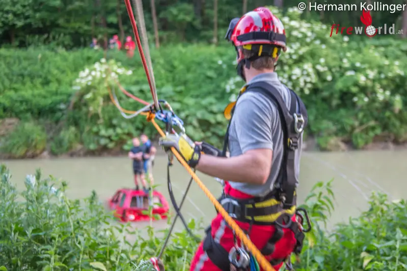ALKOVEN (OÖ): Genauso fix, wie es ist, dass das nächste Hochwasser ganz bestimmt kommt, ist auch die Tatsache, dass es dann auch wieder Personen aus Pkws zu retten geben wird. Dann vielleicht auch noch aus einem Fluss mit hoher Strömung und Treibgut. Genau das wurde am Abend des 1. Juni 2017 bei der Freiw. Feuerwehr Alkoven samt der Höhenrettergruppe trainiert und einige interessante Erkenntnisse gewonnen.