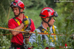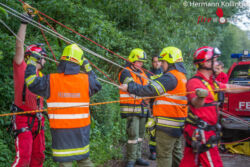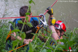 Nach Fertigstellung der Seilkonstruktion konnte einer der Retter samt Rettungswindel zum im Fluss treibenden Auto geseilt und abgesetzt werden. Die sommerlichen Temperaturen verleiteten die beiden Übungsopfer, zwei Mitglieder der Tauchergruppe, dazu, sich etwas undankbar zu zeigen. Sie schwangen kurzfristig das Seil der Seilbahn und verhalfen den Retter zu einem unfreiwilligen Kurzbad. Diese für den Rest der Mannschaft durchaus aufheiternde Einlage brachte jedoch auch einen ernsten Hintergrund zutage. Denn wer schließt aus, dass sich zu Rettende aufgrund der bereits längeren Wartezeit, möglicher Panik etc. nicht ähnlich verhält? Ein Fakt, der durchaus auch beim Realeinsatz zu bedenken sein wird. In zwei Seilläufen konnten dann beide Autoinsassen zurück ans Ufer und durch einen Wald an frischen Brennnesseln schlussendlich wieder auf die Straße zurückgebracht werden.