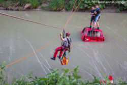Im Hochwasser feststeckende Fahrzeuge können im Einsatzfall vielfach mit einem Wasserfahrzeug (Zille, Arbeitsboot) oder zumindest Feuerwehrtauchern erreicht werden, um eine Personenrettung durchzuführen. Happiger bzw. unmöglich wird das jedoch, wenn in der Fluss eine hohe Strömungsgeschwindigkeit aufweist, in dem sich vielleicht auch Treibgut befindet (Bäume, weggeschwemmtes Material etc.). Genau davon ging das Übungsszenario auch aus. Ein Autolenker war überzeugt – wie oft in der Praxis auch – , einen überflutete Streckenabschnitt noch passieren zu können. Eine Fehleinschätzung. Das Auto wurde von den Fluten erfasst und hängt nun im Gewässer fest. Die beiden Insassen des Pkw können sich auf das Dach des Fahrzeuges retten und die Einsatzkräfte verständigen. Aufgrund der Alarmmeldung rücken auch die Höhenretter mit aus.