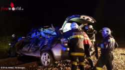 Bei Eintreffen der ersten Fahrzeuge der Feuerwehren wurde die eingeklemmte Person bereits von den Rettungskräften behandelt und war zu diesem Zeitpunkt auch bei Bewusstsein. Aufgrund der starken Verformung des Fahrzeuges gestaltete sich die Menschenrettung als äußerst schwierig.