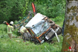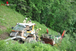 KITZBÜHEL (TIROL): Kurz nach Mittag kam es am 9. Juni 2017 bei einem Bauernhof in Kitzbühel zu einem Absturz eines Unitracs. Der Lenker wurde aus bisher ungeklärter Ursache von dem Fahrzeug auf einer Wiese überrollt und dieses stürzte hernach ca. 300 m über einen steilen Abhang in einen Graben.