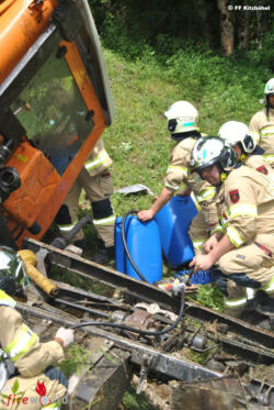 Die Feuerwehr Kitzbühel pumpte aus dem total zerstörten Unitrac noch die restlichen Betriebsmittel, Diesel und Hydrauliköl, ab. Der geringfügige Ölaustritt konnte somit gestoppt werden und Bindemittel wurde noch aufgebracht. Nachdem eine stabile Lage am Einsatzort geschaffen wurde, war der Einsatz für die Feuerwehr Kitzbühel beendet.