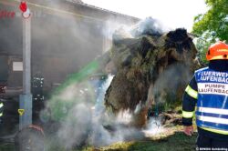 Weil sich auf Grund von Vorbereitungen für den morgigen Frühschoppen einige Kameraden im Feuerwehrhaus aufhielten konnten diese ohne Zeitverzug ausrücken. In einer Lagerhalle, wo auch einige landwirtschaftliche Geräte und Fahrzeuge gelagert waren, gerieten aus unbekannter Ursache Heuballen in Brand.