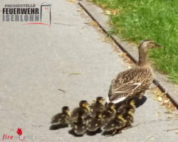 An der Einsatzstelle konnte der Kanaleinlauf sofort ausfindig gemacht werden, denn die Entenmutter lief aufgeregt flatternd und schnatternd um den Gully herum. Nachdem der Kanaldeckel von den Einsatzkräften entfernt wurde, konnten neun Küken gezählt werden, die nicht aus eigener Kraft aus dem Kanaleinlauf heraus kamen. Brandmeisteranwärter Robin Gottschall hob die Küken einzeln in einen Kescher, mit dem sie dann zur wartenden Entemutter ins Gras gesetzt wurden.