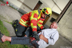 Ein weiterer Atemschutztrupp der FF Pasching konnte schließlich noch zwei bereits bewusstlose Personen im ersten Obergeschoss des Gebäudes auffinden und anschließend auch den Brandherd lokalisieren und ablöschen. Ein plötzlich eintretender Notfall erforderte schließlich den Einsatz der mitalarmierten Drehleiter der FF Leonding. Es kam zum Teileinsturz des Stiegenaufganges, weshalb der Atemschutztrupp das Objekt über die Treppe nicht mehr verlassen konnte. Eine schonende Rettung der beiden bewusstlosen Personen erfolgte durch die bereits in Stellung gebrachte Drehleiter. Die drei Feuerwehrmänner konnten sich schließlich selbstständig über eine Steckleiter auf der Rückseite des Gebäudes retten.