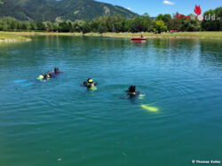 "Wenige Minuten nach dem Eintreffen der Einsatzkräfte befand sich bereits das erste Boot im Wasser und begann mit der Suche", schildert Einsatzleiter, Hauptbrandinspektor Robert Gmundner von der Feuerwehr Kraubath. Indessen wurde an der Wasseroberfläche vom Boot Ausschau nach der vermissten Person gehalten und die zehn Feuerwehreinsatztaucher suchten unterhalb der Wasserlinie den See bis hin zum Grund ab.