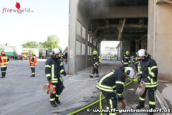 Bei Eintreffen der ersten Einsatzkräfte schlugen bereits meterhohe Flammen aus dem Abluftrohr über Dach. Als erste Maßnahme ließ der Einsatzleiter OBI Michael Schinko ein C-Rohr ins Innere des Gebäudes vornehmen, um einen brennenden Elektromotor abzulöschen. Mit einer zweiten Löschleitung wurde die Förderschnecke gekühlt. Diese Maßnahmen im Inneren des Gebäudes wurden unter Verwendung schwerer Atemschutzgeräte durchgeführt. Bis zum "Brand aus" kamen schließlich insgesamt 5 Atemschutztrupps (zu je 3 Mann) zum Einsatz.
