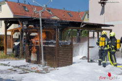 Obwohl das erste Tanklöschfahrzeug nur wenige Minuten nach der Alarmierung vor Ort eintraf, stand die komplette Müllinsel, fast das ganze Carport, sowie ein darunter abgestellter Pkw in Vollbrand. Der Brand des Carports und des Pkws konnte zwar rasch in Griff gebracht werden, jedoch erschwerend im Bereich der Müllinsel kam hinzu, dass die Flammen auch auf die für die angrenzenden Reihenhäuser dort verbaute Gas-Hauptabsperreinheit übergegriffen hatte und diese ebenfalls in Brand setzte. Die Anrainer der unmittelbaren umliegenden Häuser wurden daher von den Einsatzkräften angewiesen ins Freie zu kommen und einen größeren Sicherheitsabstand vom Brandort einzuhalten.