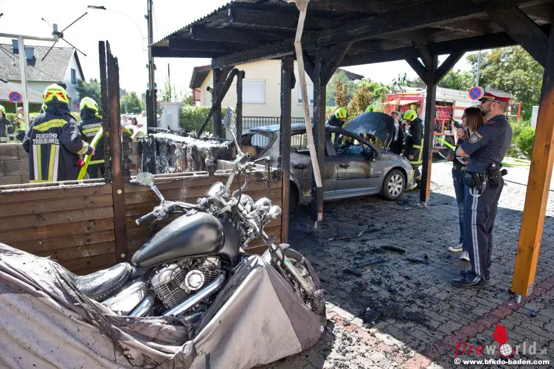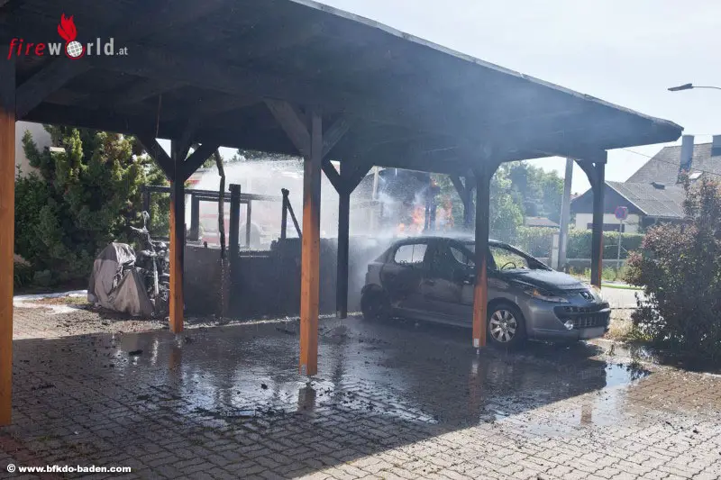 Anrainer endeckten zwar den Brand und alarmierten die Feuerwehr, jedoch konnten sich die Flammen rasch auf dem direkt angebauten Carport ausbreiten. Ein paar Fahrzeugeigentümer gelang es noch ihre Fahrzeuge in Sicherheit zu bringen. Bei einem der abgestellten Fahrzeuge war es aber nicht mehr möglich, da dieser binnen kürzester Zeit im Heckbereich komplett in Brand stand und aufgrund der enormen Strahlungshitze zu gefährlich für die Anrainer war. Bis zum Eintreffen der örtlichen Freiwilligen Feuerwehr Tribuswinkel bekämpfte ein beherzter Anrainer mit einem Gartenschlauch den Brand.
