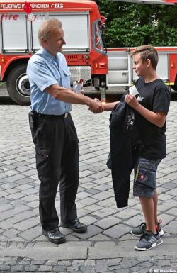 Auch die Rettungskräfte der Feuerwache Moosach, die bei dem Einsatz am Donnerstag vor Ort waren, haben es sich nicht nehmen lassen, dem Lebensretter persönlich zu gratulieren. Der 13-jährige wurde von den Feuerwehrmännern mit allem beschenkt, was ein junges Nachwuchsfeuerwehrherz höher schlagen lässt. Gut ausgerüstet mit T-Shirt und Helm begann ein spannender Tag für Florian.