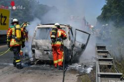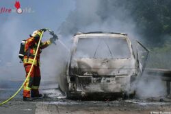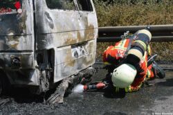 Bereits da schlugen dann erste Flammen aus dem Motorraum und er konnte sich in Sicherheit bringen und den Notruf absetzen. Beim Eintreffen der Feuerwehr stand das Fahrzeug im Vollbrand. Buschwerk hinter der Leitplanke hatte sich durch die Wärmestrahlung bereits ebenfalls entzündet. Unter Atemschutz konnte die Feuerwehr mit zwei C-Rohren das Feuer rasch unter Kontrolle bringen und schließlich ablöschen.