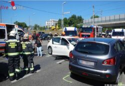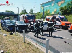 WIEN (W): Aus bisher unbekannter Ursache kollidierten am 19. Juni 2017 zwei Personenkraftwagen im Kreuzungsbereich Leberstraße / Swatoschgasse. Die Berufsfeuerwehr Wien stand gemeinsam mit der Berufsrettung und dem Notarzthubschrauber im Einsatz