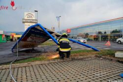 Nur wenige Meter von dem Einsatzort entfernt, knickte der Sturm eine rund 8×2 Meter große Werbetafel um. Mittels Trennschleifer konnte die stark deformierte Tafel von der Straße entfernt werden, so Schmied weiter. Die Aufräumarbeiten nach dem Unwetter dauerten bis in die frühen Abendstunden an.