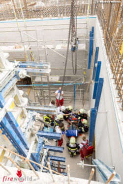 Am Einsatzort angekommen wurde der Patient bereits vom Notarztteam versorgt. Der Zugang bis zum Verletzten war über eine kleine Treppe möglich, ein schonender Abtransport über dieselbe Treppe wäre jedoch nicht möglich gewesen. Der Einsatzleiter entschied gemeinsam mit dem Notarzt den Transport bis zum Notarztwagen über den vorhandenen Baustellenkran durchzuführen. Während der Patient für den Transport stabilisiert wurde, bereiteten die Einsatzkräfte der Feuerwehr eine auf der Baustelle, für solche Unfälle vorrätig gehaltene Trage, vor und nahmen über ein Baustellenfunkgerät Kontakt mit dem Kranführer auf.