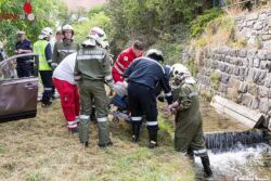Aufgrund diesen Informationen alarmierte der diensthabende Disponent laut Alarmstufe T3 (VU mit mehreren eingekl. Personen) sechs Feuerwehren zum Unfallort. Parallel dazu wurden von der Rettungsleitstelle 144 Notruf NÖ drei RTW sowie zwei Notarztmittel entsandt. Das Fahrzeug stürzte über eine etwa 2-3 Meter hohe Stützmauer in ein Bachbett. Glücklicherweise wurden durch den Aufprall keine Personen eingeklemmt, jedoch unbestimmten Grades verletzt.