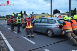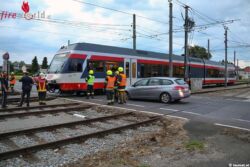 ALKOVEN (OÖ): Ein Verkehrsunfall zwischen einem Pkw und einem Zug Mittwochabend, den 28. Juni 2017, in Alkoven endete glücklicherweise glimpflich. Der Unfall ereignete sich am Bahnübergang an der Kreuzung der Hörschinger- beziehungsweise Schloßstraße mit der Strecke Linzer Lokalbahn.