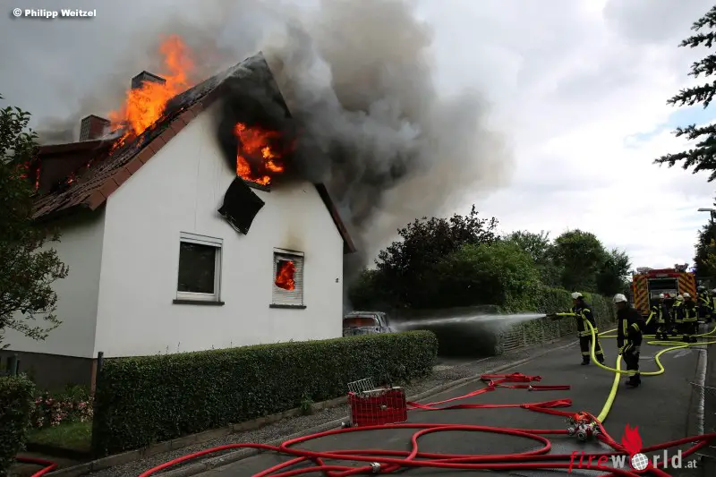 ALSFELD (DEUTSCHLAND): Lichterloh in Flammen stand am Freitagmittag, 30. Juni 2017, ein Wohnhaus am Hellfeld im Alsfelder Stadtteil Eudorf. Bei Eintreffen der Feuerwehr schlugen meterhohe Flammen aus dem Gebäude und einem davorstehenden Auto.