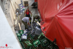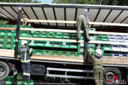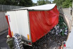 Die Ladung kam während der Fahrt in der Unterführung aus bisher unbekannter Ursache ins Schwanken und kippte seitlich aus dem Lkw. Hunderte Bierkisten und Bierflaschen landeten auf der Straße. Die Feuerwehr stand im Einsatz. In mühevoller Kleinarbeit konnte die Ladung geborgen und wieder auf Paletten verladen werden.