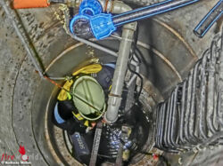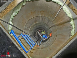 Besonderheit – unser Kamerad Peter Schieder hat erst fünf Stunden zuvor seine Prüfung zum Feuerwehr-Einsatztaucher mit zwei weiteren Kameraden abgelegt. Nun stieg er schon zu seinem ersten Taucheinsatz in den äußerst engen und rund 10m tiefen Brunnenschacht hinunter. Gesichert und versorgt mit Atemluft konnte er dort unter Wasser die Taschenlampe bergen.