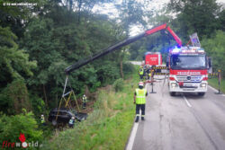 Nach Ankunft der beiden Sonderfahrzeuge wurde mit der Bergung des BMW X3 begonnen. Mit Hilfe des Ladekrans des schweren Rüstfahrzeug konnte der Geländewagen in einen Hub zurück auf die Straße gehoben und in weiterer Folge durch das Abschleppfahrzeug abtransportiert werden. Die Freiwillige Feuerwehr Wiener Neudorf stand mit zwei Fahrzeugen und sechs Mann bis kurz nach 11:15 Uhr im Einsatz.