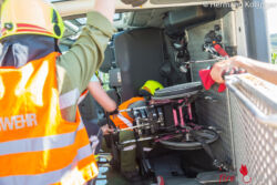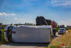 Vor Ort war es dann jedoch notwendig, die bereits anwesenden Sanitätern des Samariterbundes zu unterstützen: In einem umgestürzten Kleinbus schrien noch Kinder (teilweise körperlich und / oder geistig beinträchtigt). Das Fahrzeug dürfte zuvor durch eine Vorangverletzung mit einem Pkw kollidiert und dabei umgestürzt sein.
