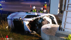 WIEN: In der Nacht auf Donnerstag, 6. Juli 2017, ereignete sich auf der S1 im Abfahrtsbereich Rothneusiedl ein folgenschwerer Verkehrsunfall. Demnach war ein Schwertransport-Begleitfahrzeug (ohne Zug-Lkw) aus unbekannten Gründen von der Fahrbahn abgekommen und mit hoher Geschwindigkeit auf die Leitschiene aufgefahren, umgekippt und den Graben entlanggeschlittert. Das Fahrzeug prallte gegen den Betonsockel und wurde letztlich gegen einen Stahlmasten der Verkehrsleiteinrichtung geschleudert.