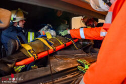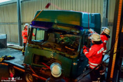 Als dann die ersten beiden Personen aus dem LKW befreit waren, wurde eine neue Lage eingespielt – „weiterer LKW-Unfall am Stauende“. Das eingesetzte Material, wie Rettungsbühne, hydraulische Schere und Spreitzer, Rettungszylinder etc. wurde also gar nicht erst auf den Einsatzfahrzeugen verlastet, sondern direkt am zweiten Übungsort erneut eingesetzt. Auch hier zeigte sich, dass eine Rettung aus einem LKW kräftezehrender und personalintensiver ist, als bei einem PKW-Unfall.