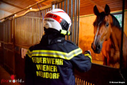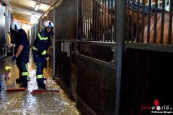 Weiter ging es am Nachmittag im Wiener Neudorfer Reitsportzentrum, wo stark einsetzende Regenfälle für den bisher dritten Einsatz des Tages für die Freiwillige Feuerwehr sorgte. Aufgrund des übergehenden Kanalsystems, stand ein Pferdestall mehrere Zentimeter hoch unter Wasser. Der gesamte Gebäudeteil musste mit mehreren Unterwasserpumpen trocken gelegt werden.