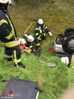 In bzw. unter dem Fahrzeug waren mehrere Verletzte schwer eingeklemmt worden. Somit mussten die Freiwilligen umfangreiches Material des Rüstwagens einsetzten, um die Verunfallten zu befreien. Dazu gehörten beispielsweise die Luftheber, Rettungsschere und -spreitzer, Glasmaster-Set (zum Herausschneiden von Scheiben), Hölzer und Bohlen. Erschwert wurden die Arbeiten durch die Tatsache, dass der Wagen auf dem Kopf und in einem Grünbereich lag. Nachdem die Übung beendet war, wurden gemeinsame potentielle Verbesserungen diskutiert, was im Ernstfall dazu führen wird, das noch fachgerechtere Hilfe geleistet wird.
