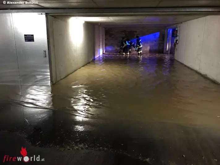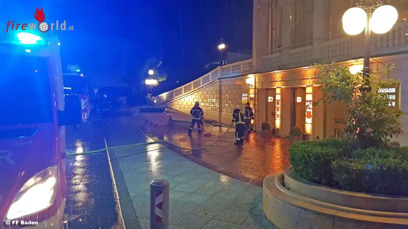 Großteils waren es überflute Straßenzüge, Unterführungen und kleinere Vermurungen, sowie mehrere Wassereinbrüche in Gebäude oder Garagen, die von der Bevölkerung über Feuerwehrnotruf 122 bei der Bezirksalarmzentrale Baden angezeigt wurden. Im Stadtgebiet von Baden sorgten die massiven Niederschläge gleich zweimal, nach Wassereinbruch ins neue Landesklinikum, für einen stundenlangen kräftezehrenden Feuerwehreinsatz. Bereits gegen 14:30 Uhr und dann gegen 22:30 Uhr waren die Regenfälle so heftig, dass Wasser in den Keller bzw. Untergeschoße des Landesklinikums eindrang. Allein hier standen insgesamt 6 Feuerwehren (Baden-Leesdorf, FF Baden-Stadt, FF Baden Weikersdorf, FF Möllersdorf, FF Pfaffstätten und FF Traiskirchen) mit etwa 100 freiwillige Feuerwehrleute und 15 Einsatz-Fahrzeugen im Einsatz. Der normale Betrieb des Krankenhauses war davon zum Glück aber nicht betroffen, die Patienten blieben unbehelligt. Die freiwilligen Feuerwehren waren bis etwa 3:00 Uhr mit den Auspumparbeiten beschäftigt.