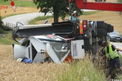 PENNEWANG (OÖ): Schwierig gestaltete sich am Mittwoch, den 12. Juli 2017, die Bergung eines Betonmischers nach einem Verkehrsunfall in Pennewang (Bezirk Wels-Land). Der Unfall ereignete sich Mittwochvormittag auf der Irnhartinger Straße im Gemeindegebiet von Pennewang.