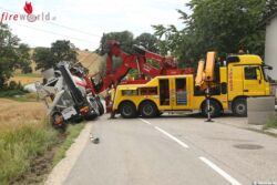 Oö: Schwierige Bergung eines Betonmischers nach Verkehrsunfall