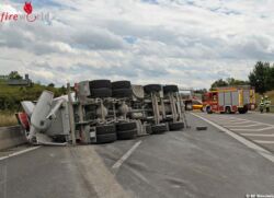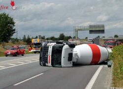 MÜNCHEN (D): Am Nachmittag des 12. Juli 2017 verlor der Fahrer eines Betonmischers die Kontrolle über sein Fahrzeug und kippte auf die Autobahn. Die Berufsfeuerwehr München rückte um 13.28 Uhr zum Einsatz auf die A99 aus.