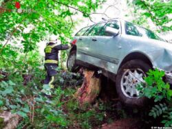 Pkw kommt von der Straße ab und bleibt an einem Wurzelstock hängen