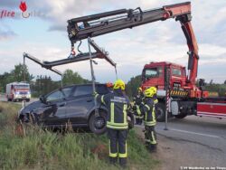 Zuerst wurde die Bundesstraße 5 im Bereich der Unfallstelle gesperrt, damit die Einsatzfahrzeug für die Bergung entsprechend aufgestellt werden konnten. Der Dacia Duster wurde mit der Bergeseilwinde des Tanklöschfahrzeuges 1 aus dem Straßengraben gezogen und konnte anschließend die Fahrt bis zur örtlichen Werkstätte selbständig fortsetzen. Um weitere Beschädigungen am zweiten Unfallwagen zu vermeiden wurde dieser mit dem Ladekran des Wechselladefahrzeuges geborgen und mittels Wechselladeaufbau-Bergung von der Unfallstelle abtransportiert.