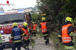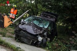 Die zwei jungen Fahrzeuginsassen konnten sich selbst aus dem Auto befreien. Sie überstanden den Unfall ohne offensichtliche Verletzungen, wurden aber zur Sicherheit vom Rettungsdienst versorgt. Die Feuerwehr sicherte die Unfallstelle ab, unterstützte bei der Bergung des Unfallfahrzeuges und rückte mit Motorsägen an um den umgestürzten Baum von der Hauseinfahrt zu räumen und sammelte die Teile des Unfallfahrzeuges ein.