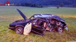 TRIEBEN (STMK): Am 15. Juli 2017, kurz nach 20 Uhr kam ein mit vier jungen Männern besetzter Pkw auf einer Nebenstraße von der Gemeinde Trieben in die Gemeinde Gaishorn aus bisher nicht geklärten Umständen von der Fahrbahn ab, touchierte einen Baum und kam in einer nahen Wiese zu stehen.