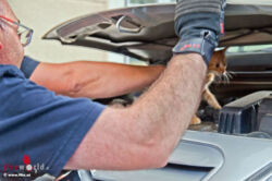 Die Erkundung ergab, dass sich der Stubentiger im Motorraum des abgestellten versperrten Fahrzeuges befinden musste. Die Feuerwehreinsatzkräfte starteten einen Versuch die Katze über die Fahrzeugunterseite zu befreien. Dazu wurde der Pkw zuerst gegen wegrollen gesichert und anschließend mit zwei Hebekissen soweit angehoben, um direkt unter dem Motorraum zu gelangen.