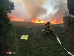 BRUCHSAL (DEUTSCHLAND): Mehrere Flächenbrände forderten in den vergangenen Tagen bereits viele Feuerwehren im gesamten Landkreis Karlsruhe. Zu einem weiteren großen Flächenbrand von etwa 12 Hektar kam es dann am Mittwochmittag, 19. Juli 2017, in Bruchsal. Der Großbrand hielt über 100 Einsatzkräfte stundenlang in Atem.